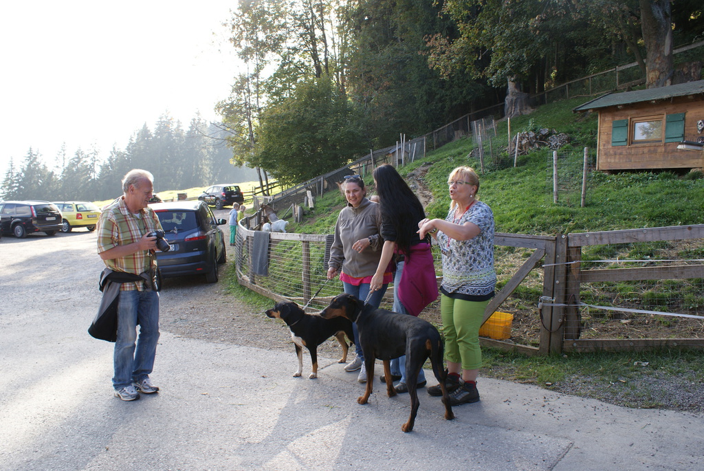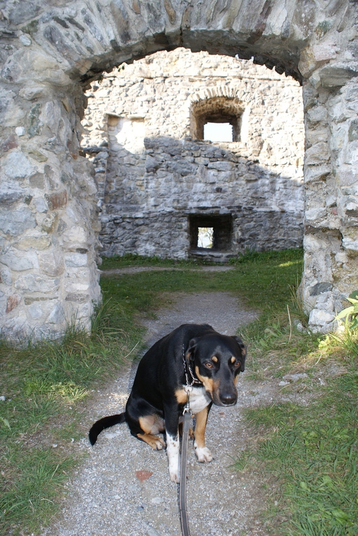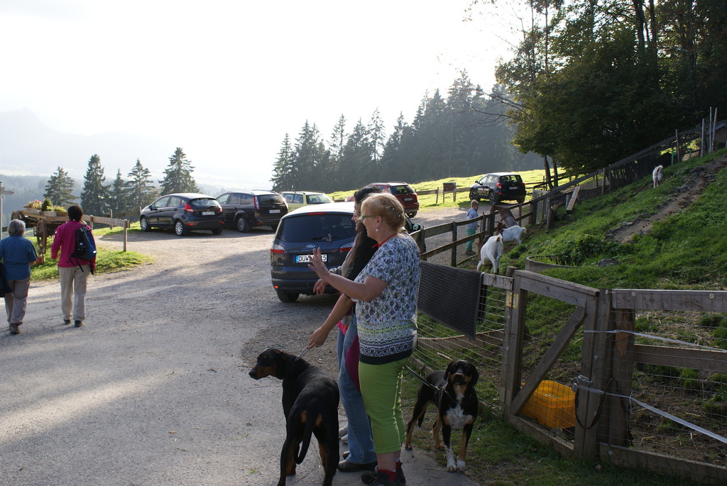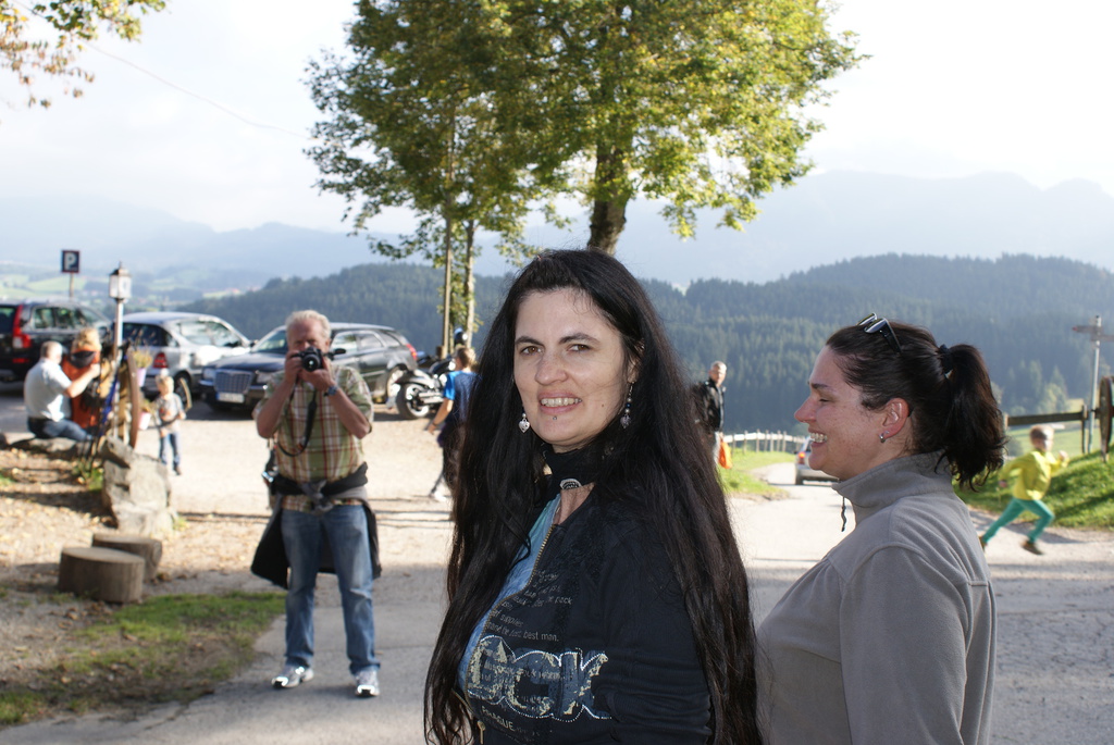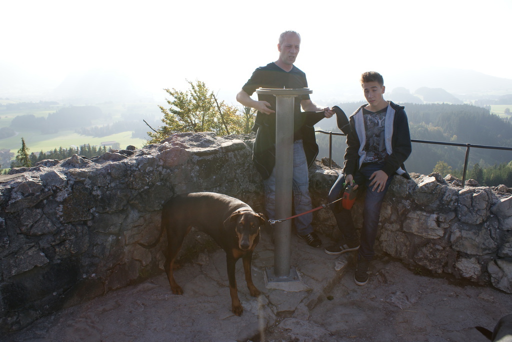 Am ersten Tag aber sind wir erst einmal nach Eisenberg bei Füssen gefahren und haben eine Wanderung zur Burg Eisenberg und Burgruine Hohenfreyberg gemacht. Dabei kamen wir an der Schloßbergalm Zell vorbei. Dort war jede Menge los und plötzlich hörten wir, wie jemand Frauchens Namen rief. Zuerst dachten wir uns nichts dabei, es wurde ja sicherlich eine andere Tanja gemeint. Doch das Rufen wurde lauter und kam näher und so schaute mein Frauchen sich doch suchend um. Man mag es kaum glauben, aber es war die Cousine von Tanja´s Mutter, die mit Mann, Nichte und deren Mann auf der Alm waren und uns zufällig gesehen hatten. Das witzige daran war, das sie erst durch mich auf mein Frauchen aufmerksam wurden. Ich steche einfach überall heraus und bin jeden Blick wert.